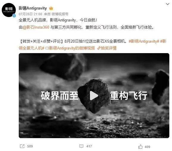 7月28日,影石创新正式官宣亮相消费级无人机品牌"影翎Antigravity",并计划在8月发布全球首款"全景无人机"。
